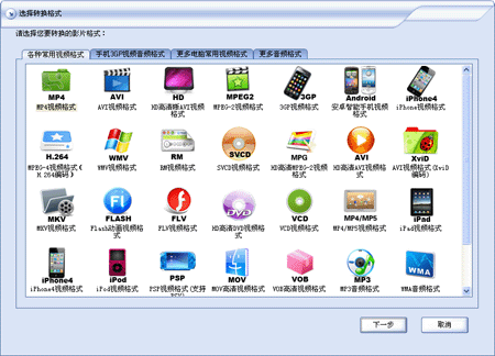 3、選擇好要轉(zhuǎn)換的視頻文件后,就自動(dòng)彈出“選擇轉(zhuǎn)換格式”窗口,在此窗口中您可以選擇要轉(zhuǎn)換的目標(biāo)格式;