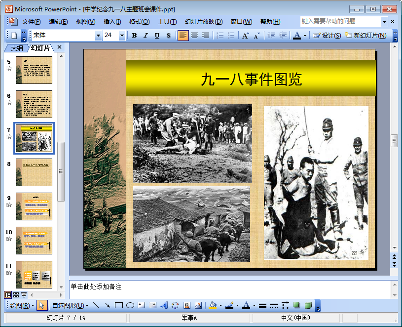 這份適合初中階段作為班會課件進行使用的ppt共由14頁組成,是一份主題為紀念九一八事變的主題班會課件,ppt內(nèi)容包括九一八事件概述、九一八事件圖覽、九一八事件視頻資料等。勿忘國恥,共襄復興,如果你需要這份九一八主題班會ppt的話,那就趕緊來東坡下載吧!