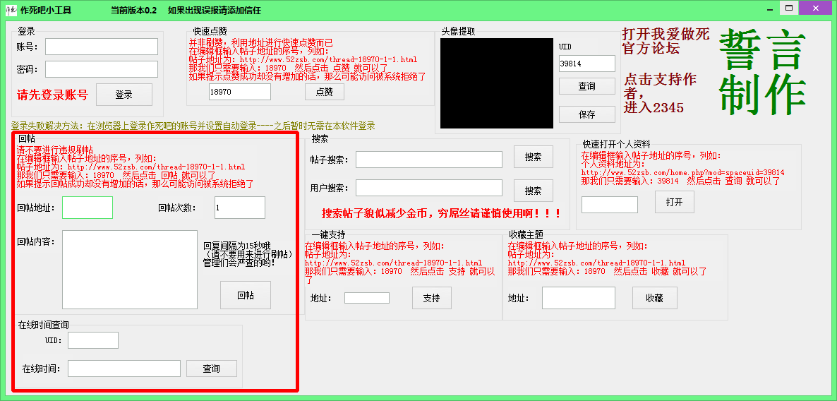 做死吧小工具是一款專為我愛作死吧論壇制作小工具,提供快速回帖、一鍵點(diǎn)贊、收藏主題、帖子搜索等等功能,幫助你方便快捷的操作作死吧論壇,需要的朋友點(diǎn)擊下面的地址即可免費(fèi)下載使用。