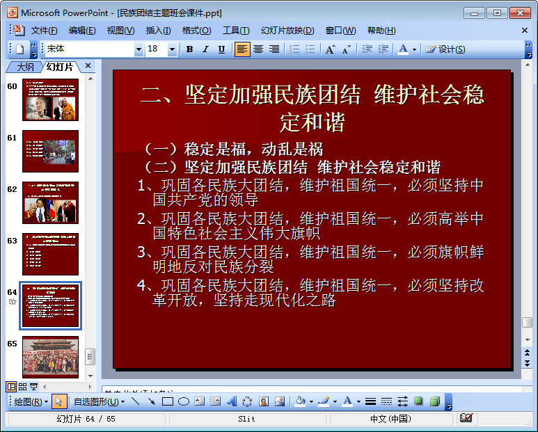 “堅定加強民族團(tuán)結(jié),維護(hù)社會穩(wěn)定和諧”。本節(jié)內(nèi)容東坡小編為大家整理帶來的是一份與民族團(tuán)結(jié)有關(guān)的ppt課件(以下簡稱為民族團(tuán)結(jié)主題班會ppt)。該ppt共65頁,內(nèi)容十分具有教育性。需要這份民族團(tuán)結(jié)主題班會ppt的朋友們只需輕輕點擊本文相應(yīng)的下載地址即可查閱該ppt的全部內(nèi)容!精品免費課件等你來下載!