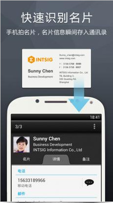 它能利用手機(jī)自帶相機(jī)進(jìn)行拍攝名片圖像,快速掃描并讀取名片圖像上的所有聯(lián)系信息,自動(dòng)判別聯(lián)系信息的類型,按照手機(jī)標(biāo)準(zhǔn)聯(lián)系人格式存入電話本與名片中心,識(shí)別率很高,對(duì)不太復(fù)雜背景的名片(圖片)中的各類信息基本可以達(dá)到全識(shí)別