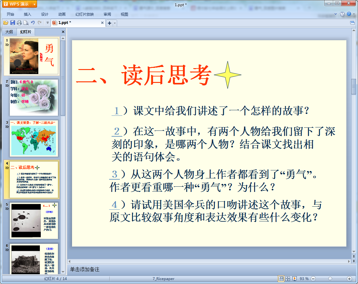 這是由東坡下載編輯整理的勇氣教學課件ppt,該課件共有14頁制作精細對課本上的內容介紹詳細,講述了法國婦女堅強、勇敢,富有智慧、具有正義感和美國傘兵身處險境,臨危不慌、意志頑強的精神。有興趣的朋友們可以來下載使用!
