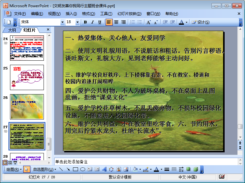 該文明友善你我同行主題班會課件主要圍繞了解校園內(nèi)不文明現(xiàn)象、如何做一個(gè)文明達(dá)人、“文明人”的標(biāo)準(zhǔn)和實(shí)現(xiàn)途徑三大方面展開,ppt共由28頁組成,需要文明主題班會ppt或是明友善班會課ppt的朋友們可以參考一下!