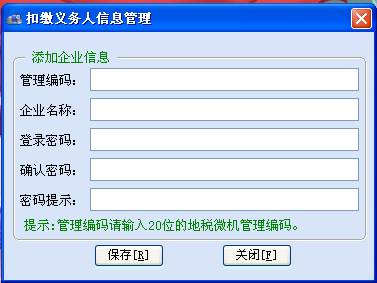 初次使用,打開桌面上的“黑龍江省個人所得稅信息管理系統(tǒng)(扣繳義務(wù)人端)”圖標(biāo),在彈出的界面添加企業(yè)的信息,管理編碼為企業(yè)地稅稅務(wù)登記證副本右上角20位微機(jī)編碼,登錄密碼與確認(rèn)密碼自行設(shè)置(但要記住設(shè)置的是什么,一但密碼忘記是無法找回的),密碼提示請設(shè)置的與密碼相關(guān),以便想起密碼。設(shè)置完后點(diǎn)【保存】按鈕,再重新登錄軟件。