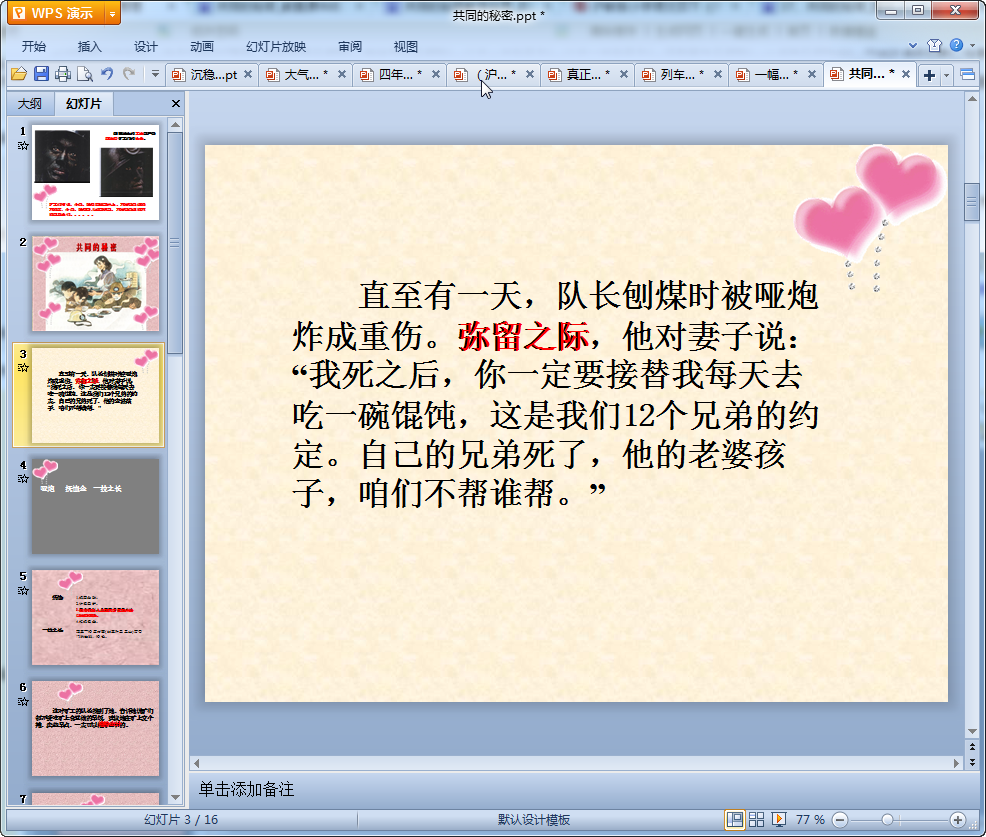 教學(xué)中的另一個關(guān)鍵詞“共同”也是我實施教學(xué)的抓手。這個“共同的秘密”是12個礦工約定的秘密,更是他們的妻子和孩子共同的秘密。正因為有了這些人的參與,這個約定才得以延續(xù),這份愛才能傳遞下去。我就用這個“共同”引出了礦工們的“妻子、孩子”,再讓學(xué)生找找從哪些句子中體會到了這個約定在延續(xù)。學(xué)生從“來去匆匆的人流不斷,而時光變幻之間惟一不變的是不多不少的12個人。更重要的是,前來光臨餛飩攤的人,盡管年輕的代替了年老的,女人代替了男人,但從未少過12個人!边@兩句話中體會到了約定在12個礦工的妻子和孩子中延續(xù)!澳贻p的代替年老的、女人代替男人、從未少過12個人”說明每天吃一碗餛飩的約定在十二名礦工的兒子、妻子中傳遞著。“時光變幻之間惟一不變的是不多不少的12個人。”在指導(dǎo)理解這兩句話的過程中,也讓學(xué)生能感受到“12”這個數(shù)字的含義,它已經(jīng)超越了數(shù)字本身的含義,而是包含了12個家庭的愛。