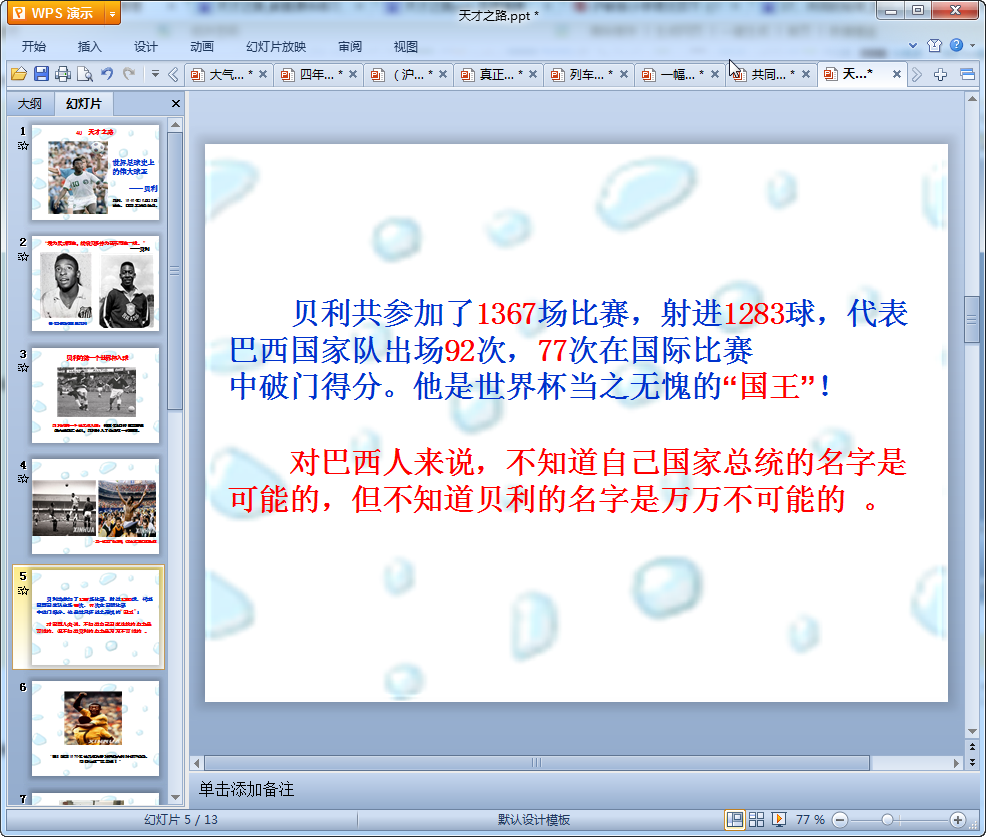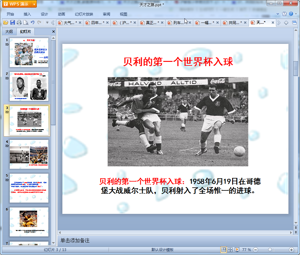 這是一篇天才之路教學(xué)課件,課件講述了球王貝利的經(jīng)歷,另配有相應(yīng)的圖片能讓學(xué)生們在課堂上更快的學(xué)習(xí)課文,有興趣的老師們可以來我們這里點(diǎn)擊下面的地址免費(fèi)的下載使用!