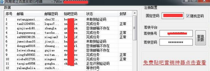 網(wǎng)易密正百度改密掃號器其實(shí)就是一款多功能的網(wǎng)易郵箱掃號器。不但操作上面十分的簡單,而且最重要是讓大家快速掃描到很多的賬戶郵箱,并且還能夠自動進(jìn)行改密!需要的就趕緊來東坡下載。