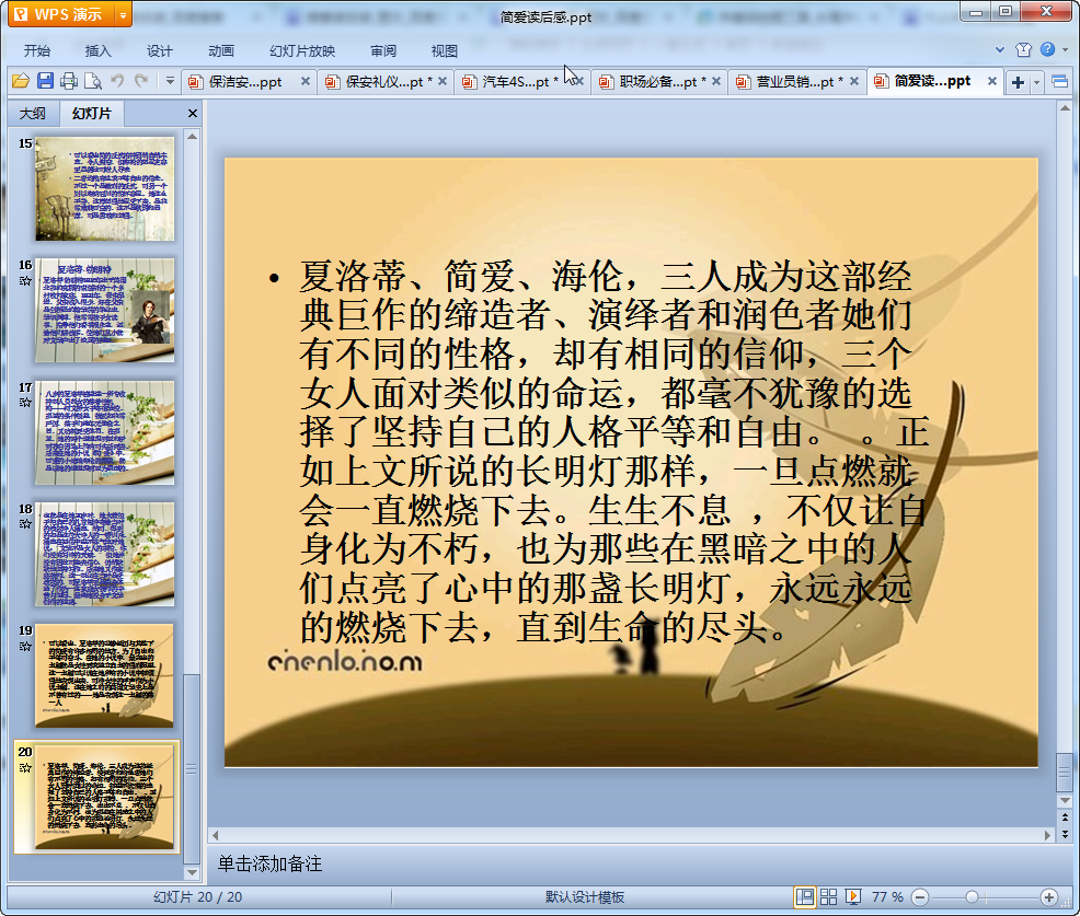這是我們東坡下載為大家準(zhǔn)備的一篇簡愛讀后感ppt,內(nèi)容比較精美全篇ppt共有20頁,有需要準(zhǔn)備這簡愛讀后感ppt類型文檔的朋友可以直接點(diǎn)擊下面的地址免費(fèi)的下載這篇簡愛讀后感ppt!