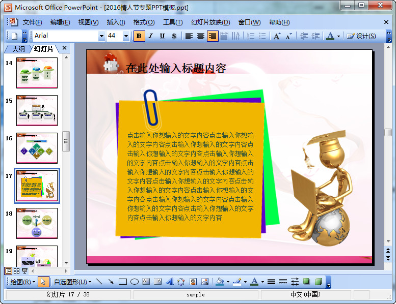 2016情人節(jié)專題ppt模板,總共有38頁。相傳在情人節(jié)這一天,表白的話,成功的幾率特別高,這不,2016年的2月14日,又是西方的情人節(jié)了,如果你有什么好的創(chuàng)意方案的話,都可以來東坡下載看看這份2016情人節(jié)專題ppt模板哦!