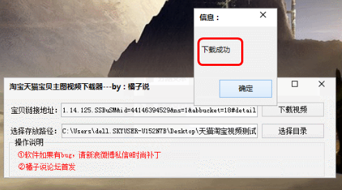 淘寶天貓主圖視頻下載器,只需將淘寶或者天貓寶貝地址放入點(diǎn)擊下載即可下載視頻到指定文件夾!