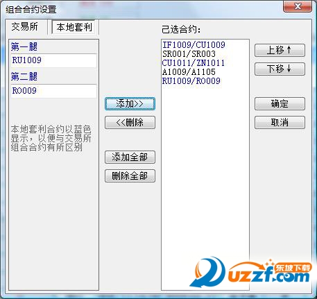 本地套利行情定制:在【組合行情】表格內(nèi)點右鍵,選擇【設置顯示合約】即彈出如下圖(3-17)的設置窗口,在其中選擇本地套利標簽頁,添加自己關注的合約。添加好之后點【確定】即可將相應的套利行情顯示到【組合行情】表格內(nèi),行情表格里的【組合類型】顯示為【本地套利】,以便于交易所直接支持的套利作以區(qū)別。如圖(3-20)