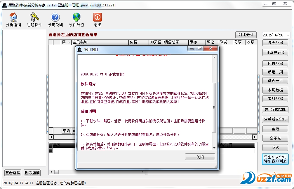 3、讀完數(shù)據(jù)后,關(guān)閉讀數(shù)據(jù)小窗口,回到主界面,此時(shí)您可以按軟件列有的功能查看該賣(mài)家的營(yíng)業(yè)狀況了。