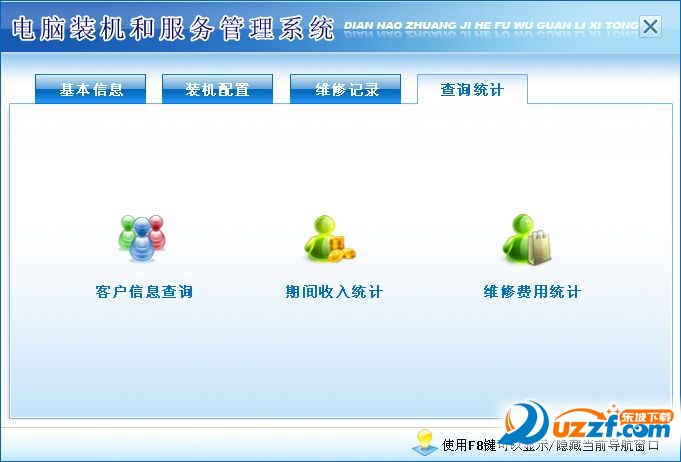 4.查詢統(tǒng)計(客戶想信息查詢、期間收入統(tǒng)計和維修費用統(tǒng)計)。