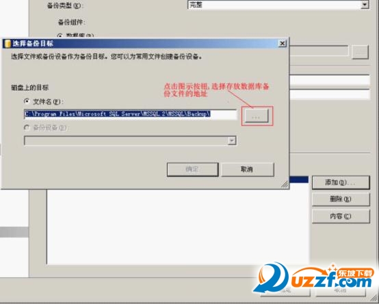 4 在彈出對話框中,點(diǎn)擊圖示按鈕,選擇存放數(shù)據(jù)庫備份文件的地址