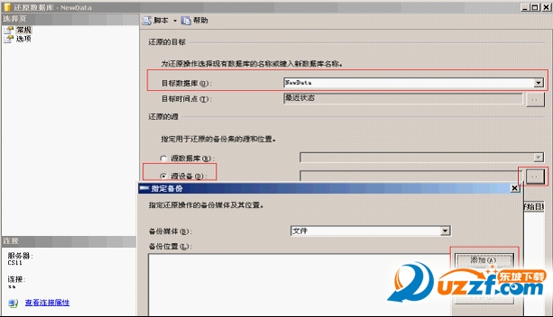 3在彈出對話框中,選擇源設(shè)備,點(diǎn)擊后面的按鈕,彈出指定備份對話框,點(diǎn)擊添加按鈕,選擇.bak源文件,找到后,點(diǎn)擊確定