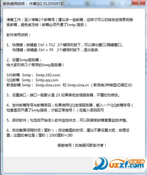 功能間隔時間,自動截圖發(fā)到指定郵箱,建議用新浪郵箱發(fā)送,比較穩(wěn)定。∴]箱需要開通{Smtp},近日測試163郵箱,會出現(xiàn)判斷為垃圾郵件。