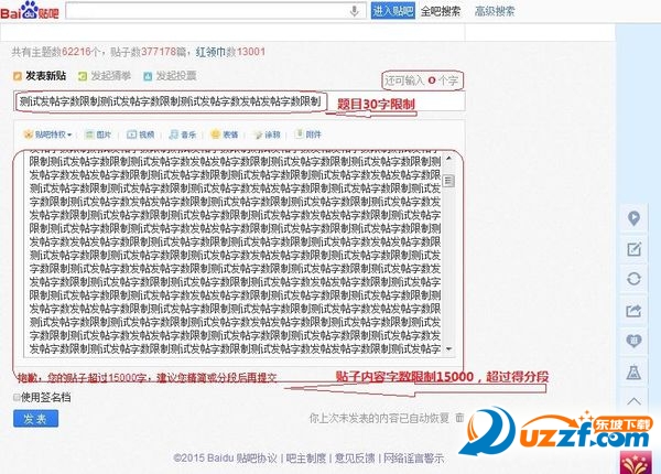 1、發(fā)表主題貼,題目限制為最多30字,帖子內(nèi)容為15000字,超過要分段。