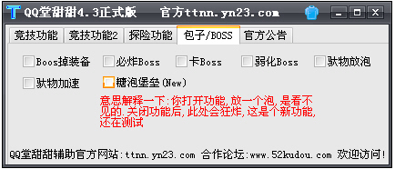 QQ堂甜甜4.3正式版國(guó)慶版新增了一個(gè)新功能,糖泡堡壘,就是你打開功能,放一個(gè)泡,是看不見的,關(guān)閉功能后,此處會(huì)狂炸,還在測(cè)試.