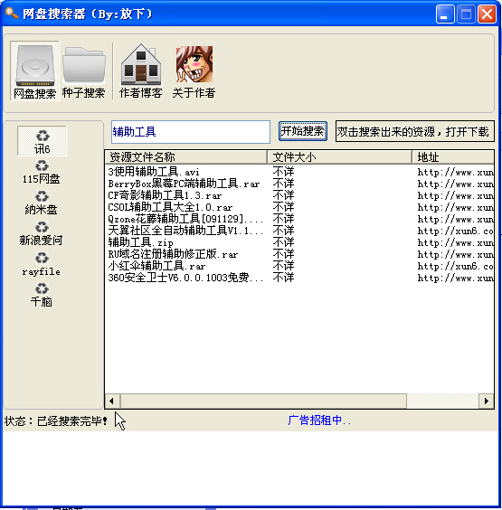 網(wǎng)盤(pán)搜索器可以搜索6大流行網(wǎng)盤(pán),是一個(gè)綜合性的網(wǎng)盤(pán)資源搜索器,集成了訊6網(wǎng)盤(pán)資源搜索器,115網(wǎng)盤(pán)資源搜索器,納米網(wǎng)盤(pán)資源搜索器,新浪愛(ài)問(wèn)網(wǎng)盤(pán)資源搜索器,rayfile網(wǎng)盤(pán)資源搜索器,千腦網(wǎng)盤(pán)資源搜索器。