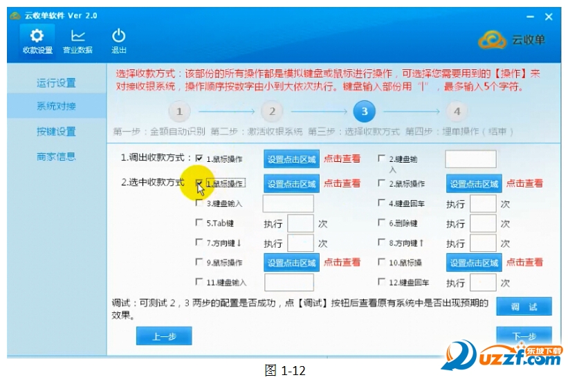 我們將鼠標(biāo)點(diǎn)擊【云收單】按鈕操作,設(shè)置在云收單軟件——【系統(tǒng)對(duì)接】里面,如圖1-10所示,勾選【鼠標(biāo)操作】,點(diǎn)擊【設(shè)置點(diǎn)擊區(qū)域】,截取如圖1-11所示的【云收單】按鈕區(qū)域。