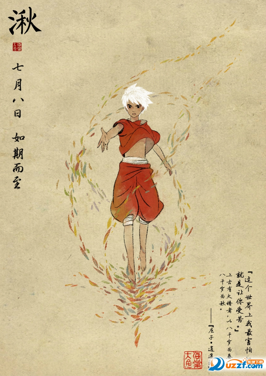 椿站在盛開的海棠花上踮腳旋轉(zhuǎn),遠(yuǎn)眺前方的她似乎要像誰(shuí)告別。五彩的秋葉環(huán)繞著湫,他伸出手似乎要帶著誰(shuí)離開。兩人的角色海報(bào)中都有取自《逍遙游》的一句話:“上古有大椿者,八千歲為春,八千歲為秋”,似乎暗示著椿與湫之間互相糾葛的宿命。