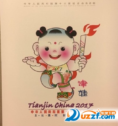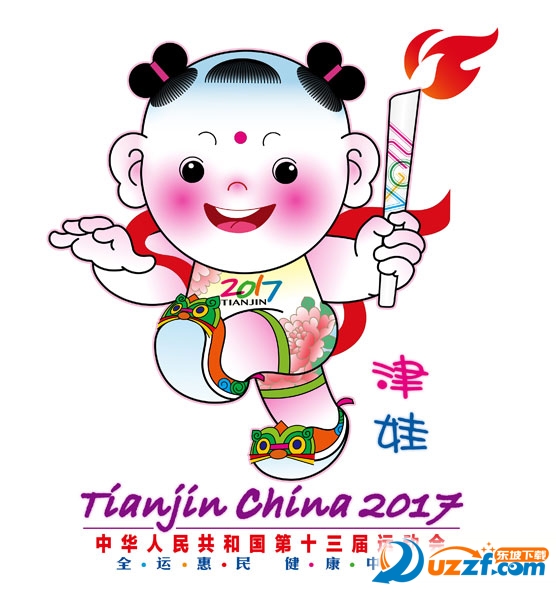 吉祥物取名為“津娃”,取材于天津楊柳青年畫,并與現(xiàn)代卡通形象進行了有機整合,具有濃郁的民族風格和天津特色!敖蛲蕖鄙碇档せ▓D案服裝,腳穿虎頭鞋,手持全運火炬,做出跳躍的動作,傳遞出運動的概念,整體形象詼諧、幽默、生動。