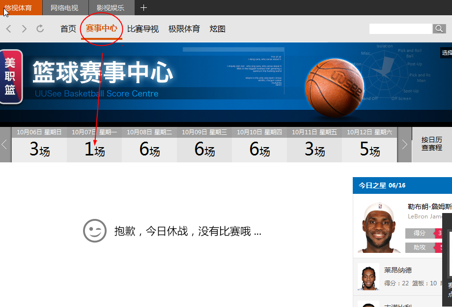 3、對于熱愛體育的人們來說,這里面有最人們的籃球賽事,點擊【賽事中心】。就能盡情觀看