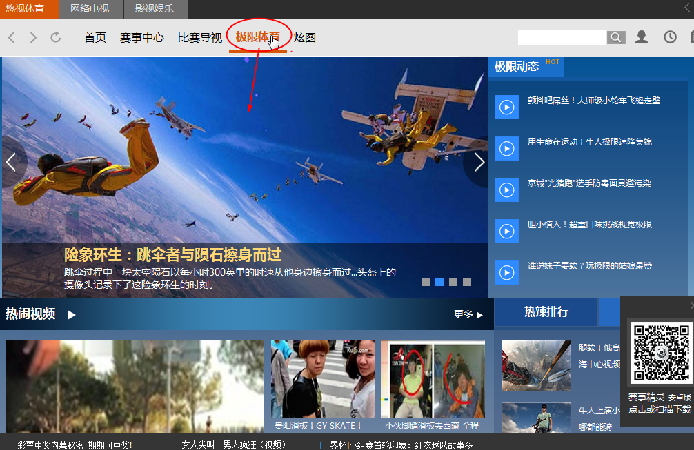 4、對于籃球不感冒的你來說,極限項目或許改算是你的最愛吧!,點擊優(yōu)視體育,點擊【極限體育】
