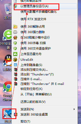 5、測(cè)試下載的保存路徑,如果電腦桌面都仍然不可以判斷當(dāng)前問題所在,則再更換到其他盤測(cè)試,如全部磁盤測(cè)試了仍然不可以。Win7、win8用戶可以,退出迅雷,右鍵迅雷的快捷方式圖標(biāo)-以管理員身份運(yùn)行嘗試.