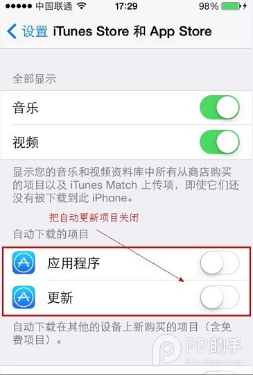 1、在設備的“設置--iTunes Store和App Store”把自動下載的項目—關閉掉更新和應用程序選項,防止自動連接到App Store來更新。(如上圖)