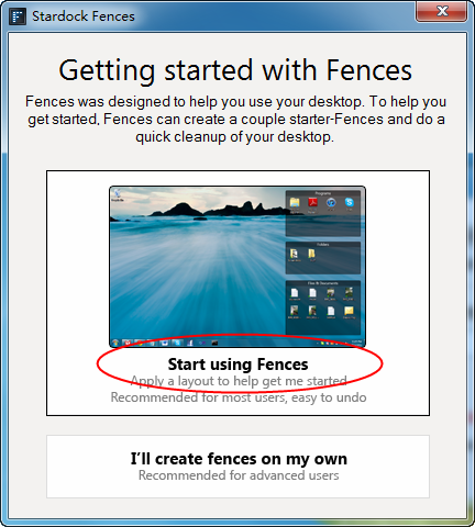 2、安裝完成后點(diǎn)擊【Start Using Fences】開始使用桌面美化軟件(Fences)