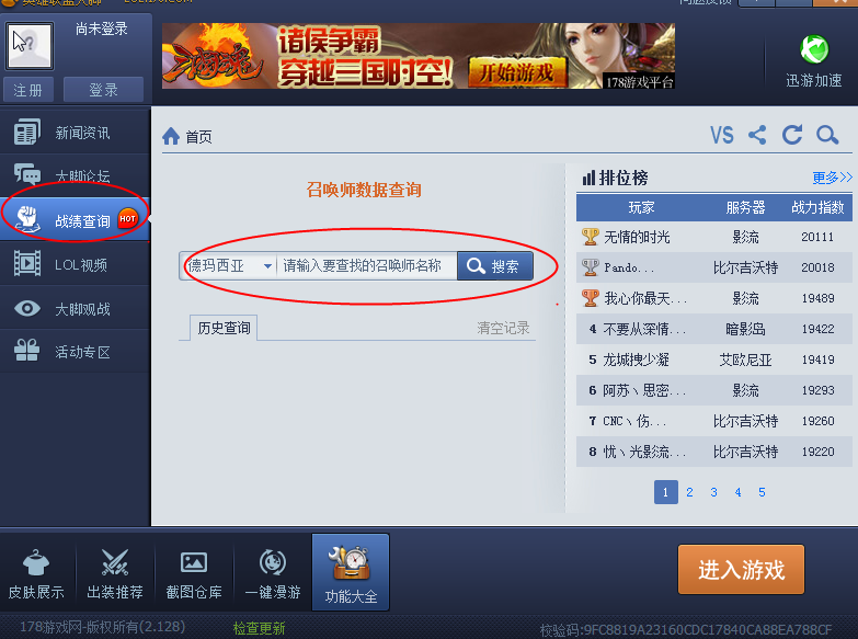 3、如果想知道自己在哪個區(qū)的戰(zhàn)績,可以點(diǎn)擊【戰(zhàn)績查詢】,在出來的頁面中輸入自己的信息,點(diǎn)擊【搜索】