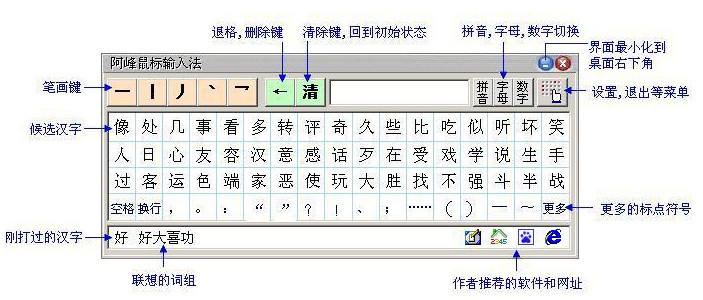 阿峰鼠標(biāo)輸入法跟手機(jī)筆畫輸入法一樣,只要輕點(diǎn)鼠標(biāo)就可以輸入。