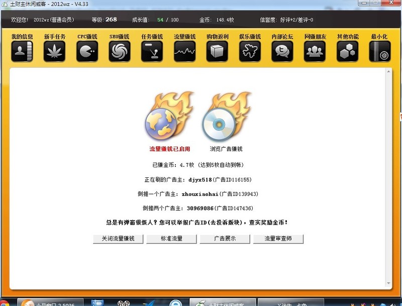 2、掛機(jī)賺錢。這是最簡單的方式,收益也比較少。只要開著土財(cái)主,打開里面的流量賺錢功能就行,軟件最小化就行!2M帶寬的每掛3.5小時(shí)收5金幣左右)。如果你是網(wǎng)站主,需要流量,也可以買,質(zhì)量極高!)