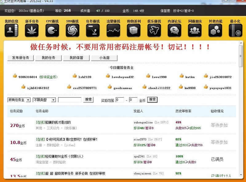 1、新手任務(wù)賺錢,這是土財(cái)主站長特意弄的,為的是讓新加入的會員能夠盡快熟悉軟件的操作,照著里面的提示完成簡單的任務(wù)就有不少金幣,等于白送。(詳情見土財(cái)主界面全圖)
