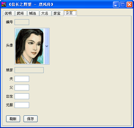 武將編輯屬性里的【親父】、【養(yǎng)父】,公主編輯里的【父】、【夫】屬性對應(yīng)的數(shù)字均為武將編號。