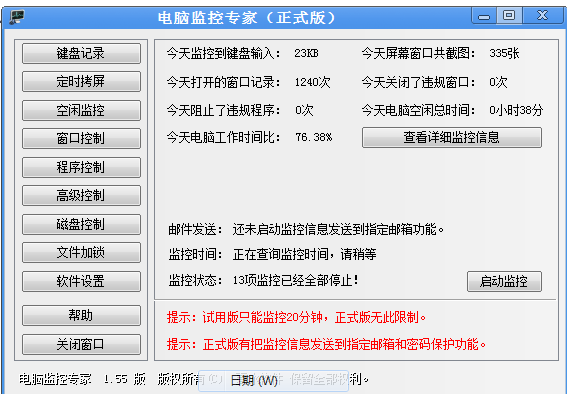 高級輔助功能:軟件還有把所有監(jiān)控的信息(鍵盤輸入記錄,屏幕截圖,活動窗口記錄和違規(guī)記錄等)發(fā)送的指定郵箱的功能,讓你可以輕松使用網(wǎng)絡監(jiān)控。并且你可以設置軟件的密碼,讓不知道密碼的人,無法對軟件的設置進行修改或刪除。軟件還有定時關機功能,你可以指定每天幾點幾分關閉計算機。