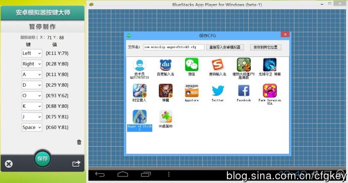安卓模擬器按鍵大師,可以輕松制作安卓模擬器上所需要的重力腳本。及能自動檢測已安裝到模擬器里的游戲。可以直接導入到模擬器里,也可以生成到其它目錄。