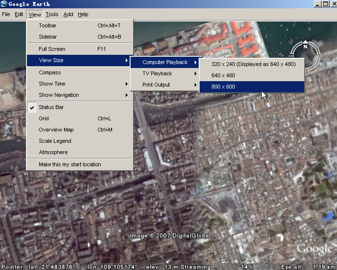 1.將Google Earth 設(shè)置成如下圖所示的界面:首先隱藏左邊的sidebar,然后在設(shè)置View----View Size -----Computer Playback-----800*600 選項(xiàng)即可。當(dāng)然,你還需要開啟Google Earth的 Terrain 選項(xiàng)。