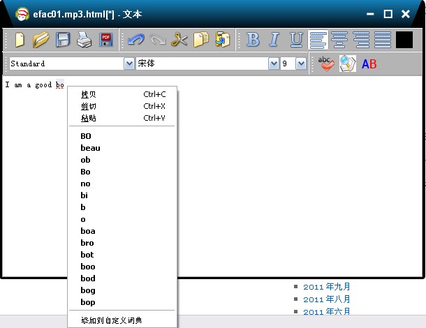 你可以將鼠標(biāo)移動(dòng)到紅色下劃線的單詞處鼠標(biāo)右擊,來替換成近似的正確單詞或?qū)⒃搯卧~添加到你自定義詞庫中。