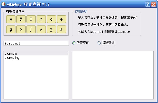 聽音查詞模式下,用戶在默認(rèn)輸入為[igza:mpl]的輸入文本框中輸入合法的音標(biāo)。單詞查詢結(jié)果便會(huì)在左下文本框中實(shí)時(shí)顯示。鼠標(biāo)點(diǎn)擊其中任何一個(gè)單詞選項(xiàng),都會(huì)在右下文本框中顯示出該單詞的詳細(xì)信息。如上面截圖圖中示例。