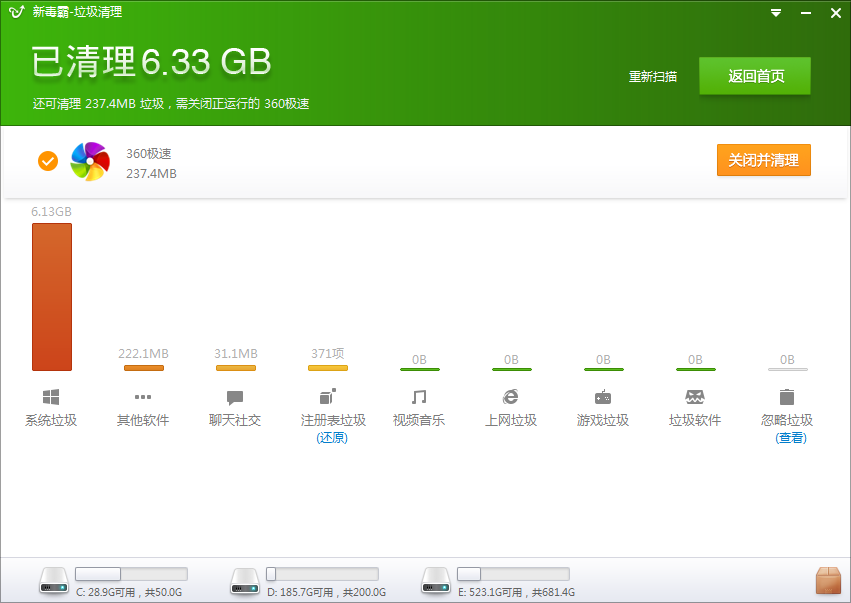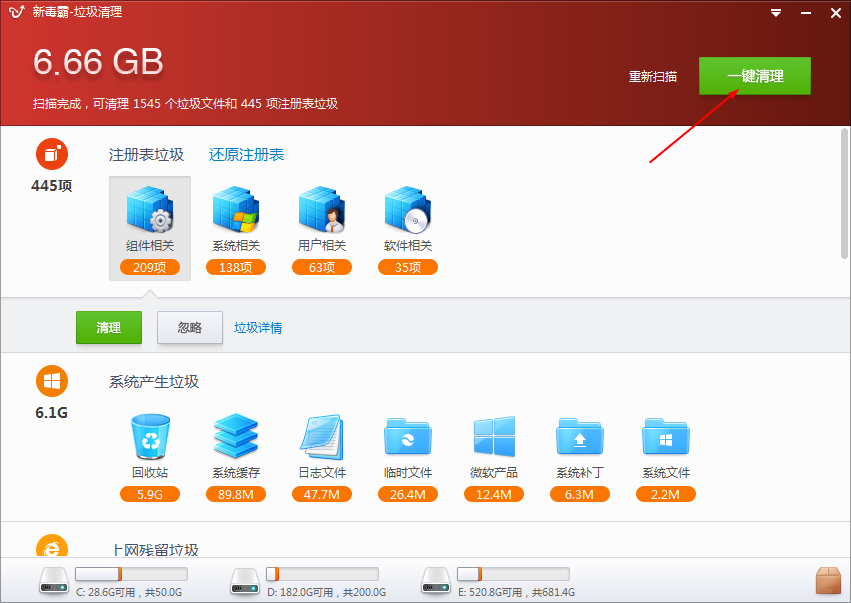 這是從新毒霸中提取出來的一個(gè)獨(dú)立版的垃圾清理軟件,幫你一鍵清理系統(tǒng)盤垃圾。方便攜帶,隨時(shí)隨地打開,一點(diǎn)即可。