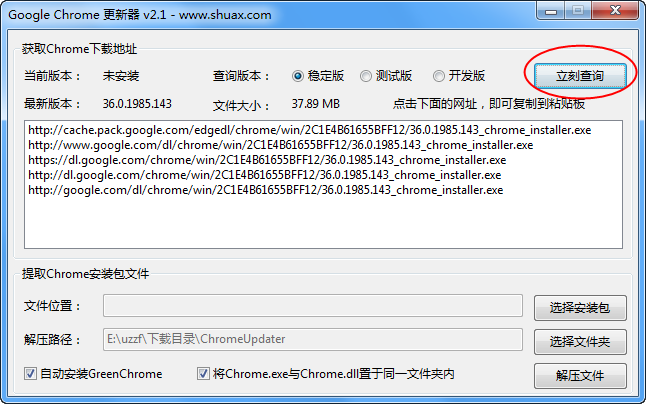 1、程序后選擇要更新的Google Chrome版本(支持穩(wěn)定版、測試版和開發(fā)版),然后點擊“立刻查詢”。