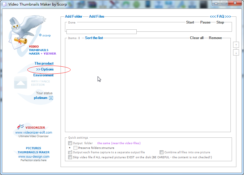 該實用工具可用于家庭視頻編目和網(wǎng)絡(luò)視頻共享的支持,程序雖然是英文的,但是非常容易使用,無需做任何設(shè)置,直接打開視頻文件,然后點擊Start按鈕即可生成,非常方便。當(dāng)然你也可以在選項那里進行設(shè)置,有很豐富的選項可以讓你自由的控制所制作縮略圖的樣式!