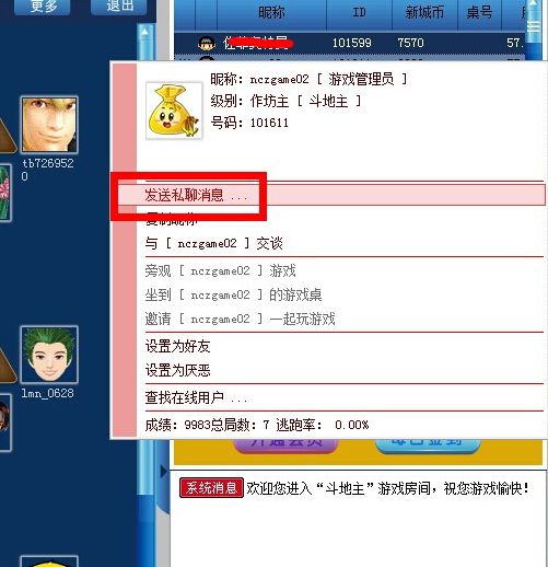 6、右擊nczgame02這個賬號,選取“發(fā)送私聊消息”。