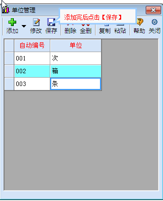 在【商品資料管理】點擊【單位】彈出單位管理窗口后點擊添加,輸入單位的名稱后【保存】即可。如圖所示: