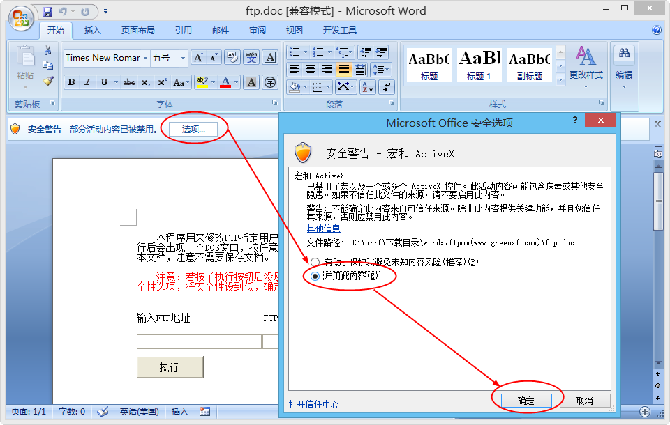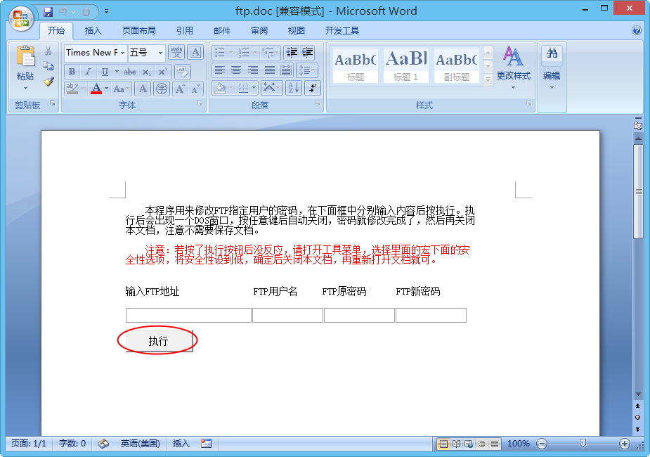 這是用Word編寫的一個修改指定FTP用戶密碼的工具,是不是覺得很奇葩。其實Word的功能是很強大的,由于Word里面是集成VB,所以作者直接就是用Word編寫了這么一款FTP密碼修改工具,看起來是不很高端。