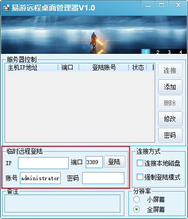 3、你也可以直接在下面的“臨時(shí)遠(yuǎn)程登陸”中輸入IP和端口進(jìn)行遠(yuǎn)程連接