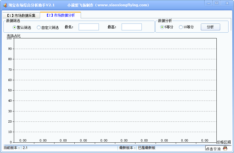 淘寶市場綜合分析助手是一個非常實用的資深淘寶賣家輔助工具,該助手方便廣大淘寶賣家輕松獲取關(guān)鍵詞top100商品的各種資料并導(dǎo)出,分析市場價格區(qū)間占比,市場銷量占比,市場價格-銷量綜合的綜合市場分析,并提供柱狀圖報表進行查看。