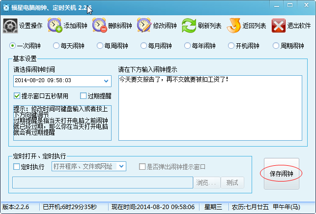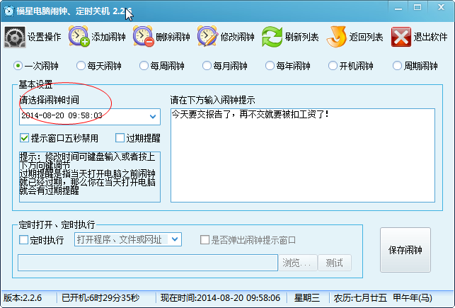 鬧鐘時(shí)間到了卻沒開電腦?電腦待機(jī)了不能鬧鐘?福星鬧鐘獨(dú)創(chuàng)的過期提醒功能,到點(diǎn)了未能正常鬧鐘當(dāng)天會有過期提醒。